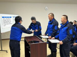 朝礼では永年勤続表彰が行われ、30年勤続の社員が2名、10年勤続の社員が1名表彰されました。長年にわたり会社を支え続けてきたその姿は、本当に素晴らしく、若手社員にとっても大きな刺激となる機会となりました。継続することの大切さや、日々の積み重ねの重みを改めて感じる場となりました。